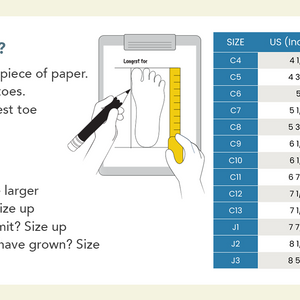 • Foot length falls between two sizes? Choose the larger size! (Example: Between C10 and C11, choose C11.)